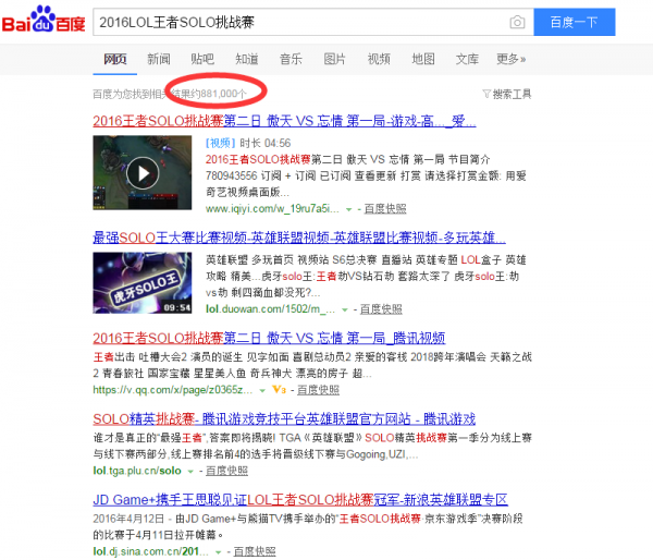 抛开DOTA2上海特级锦标赛而言,这两场比赛其中京东杯技嘉GTL英雄联盟挑战赛的百度搜索结果才一万多,是非常惨淡的了,而第二个比赛即使蹭了王校长的热度也才八十多万的搜索量,以LOL的玩家数量和王校长的影响力来说无疑是失败的。