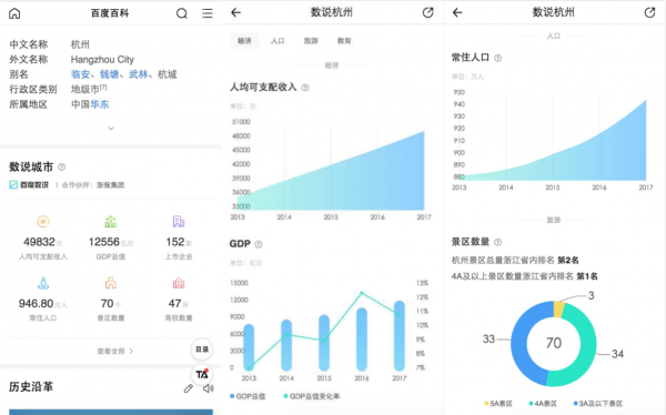 数说浙江上线后,浙江各地城市百度百科多了不少新花样。打个比方,用户在百度搜索栏中输入城市名称,比如“杭州”,便可在相关内容页中看到杭州的城市大数据,包括人均可支配收入、GDP总值、上市公司数量、常住人口、高校数量、景区数量等,点击“查看全部”还可深入了解各项数据的历史沿革和变化趋势,在提升整体认知的同时,优化公众接触城市信息的使用体验。