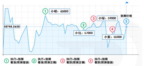 小红预测的57000<58748.2658,且因看涨,所以预测正确