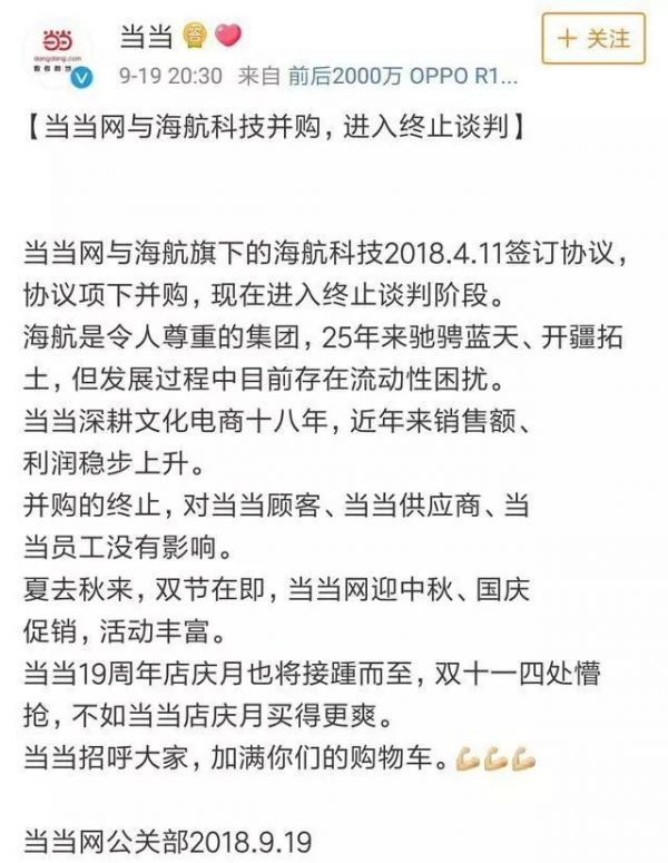 当当也发布公告,但表示并购协议进入终止谈判阶段 。 同时当当表示,“海航是令人尊重的集团”,“但发展过程中目前存在流动性困扰。”