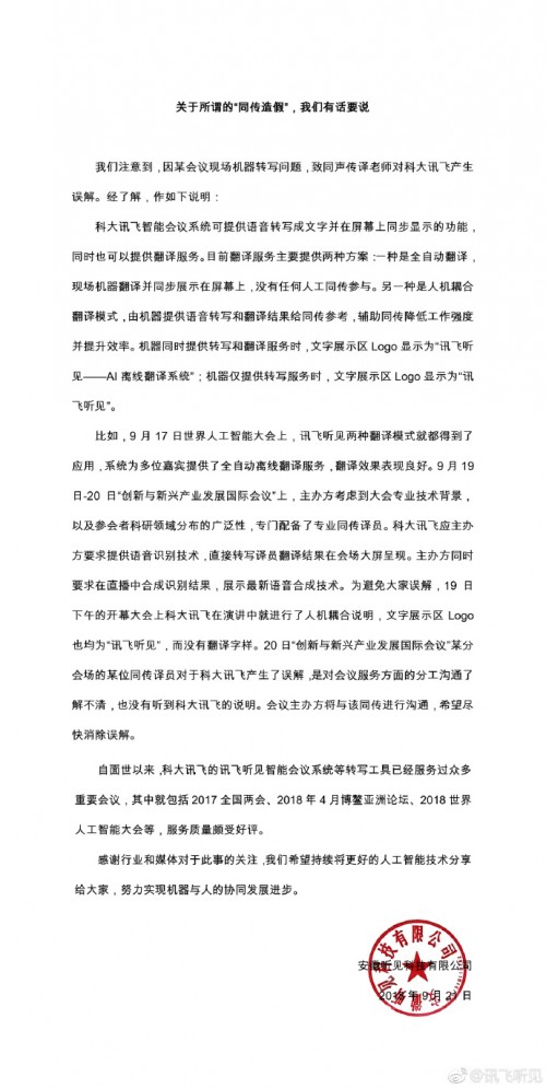 随后,科大讯飞官方声明称:考虑到会议的学术背景和所涉及专业,主办方对讯飞提出的具体会务需求是:讯飞听见智能会议系统仅需对演讲人员的语音及同传人员的语音进行实时转写文字上屏。