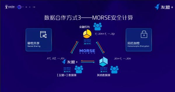 当下,友盟+正在与摩斯安全计算平台进行合作,不仅可以以安全的方式接触到原始特征,同时融合多个数据源的特征,对单个变量和多变量组合进行分析和建模。在分析和建模过程中,对原始变量特征和目标变量进行保护。在摩斯安全计算平台上,使用过程基于同态计算等密码学技术,从原理上保证了隐私和安全。每一个变量、每一个数据源的使用,通过区块链技术可存证可追溯,区块链技术在数据合作的场景上发挥了天然的优势。