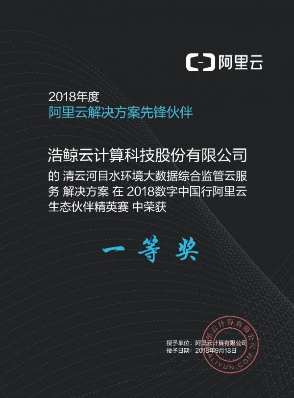 近日,“2018数字中国行阿里云生态伙伴精英赛”总决赛结果重磅揭晓,浩鲸科技“清云河目水环境大数据综合监管云服务”产品拔得头筹,荣获全国一等嘉奖,并且获得了“2018年度阿里云解决方案先锋伙伴”的荣誉称号。