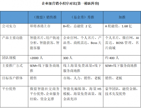 据不完全统计,目前针对企业销售、智能名片、智能营销等相关小程序产品,陆续出现了不下上百家。激烈竞争的态势,已经呈“一字阵”拉开。纵观几大小程序企业,围绕企业营销这一个核心命题,玩出了不同的花样。如何看清这些企业竞争的模式,也是目前大家非常关注的一点。如果用一个简单的图表直观反映的话,大致可以将几款主要产品做以下对比: