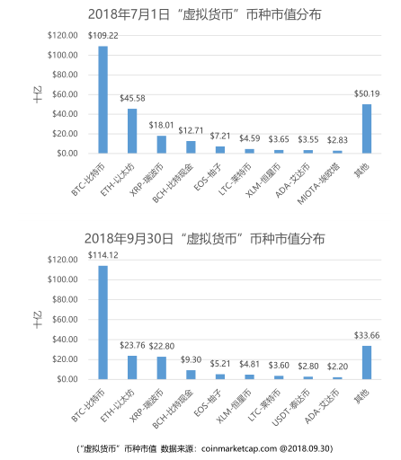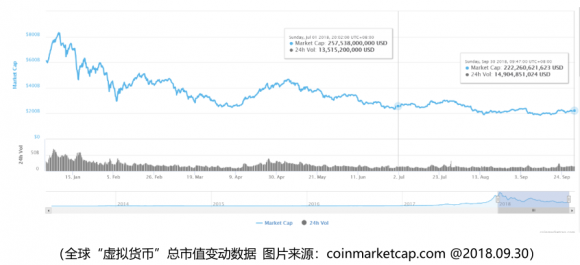 2018年7月1日至2018年9月30日三个月期间,全球“虚拟货币”的总市值持续5月以来的低迷,总体依然呈现下跌趋势。