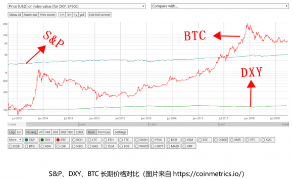 “虚拟货币”市场继承了传统金融市场的种种风险,但是在具体程度上又有所区别。通过对2013年4月末至2018年9月标准普尔指数(S&P)、美元指数(DXY)、比特币(BTC)三者的价格监测发现“虚拟货币”波动程度远高于另外两者。