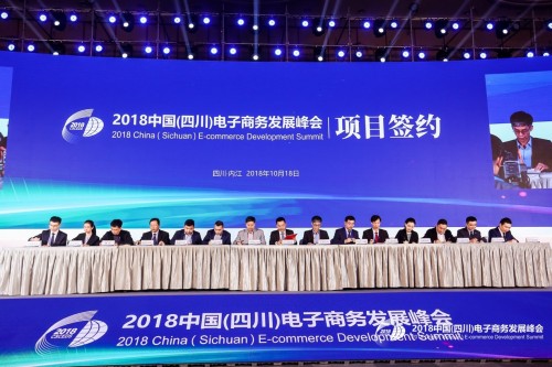 同时,为切实推进电子商务优势企业和项目在四川落地,领袖峰会上举行了隆重的项目签约仪式。此次电商峰会共签约电商物流项目64个,投资总额123.76亿元。其中,今天会议现场签约项目28个,投资总额48.08亿元。其中,四川奥旋健康大数据中心项目,“甜城味”蜜饯产业园项目,深圳万汇国际商品博览城项目,苏宁易购电子商务内江运营中心项目,传化电商中心红星美凯龙家居商城项目,合江县域电子商务发展项目,中国国际电子商务有限公司、四川亿邦动力电子商务有限公司与内江市商务局战略合作项目进行现场签约。