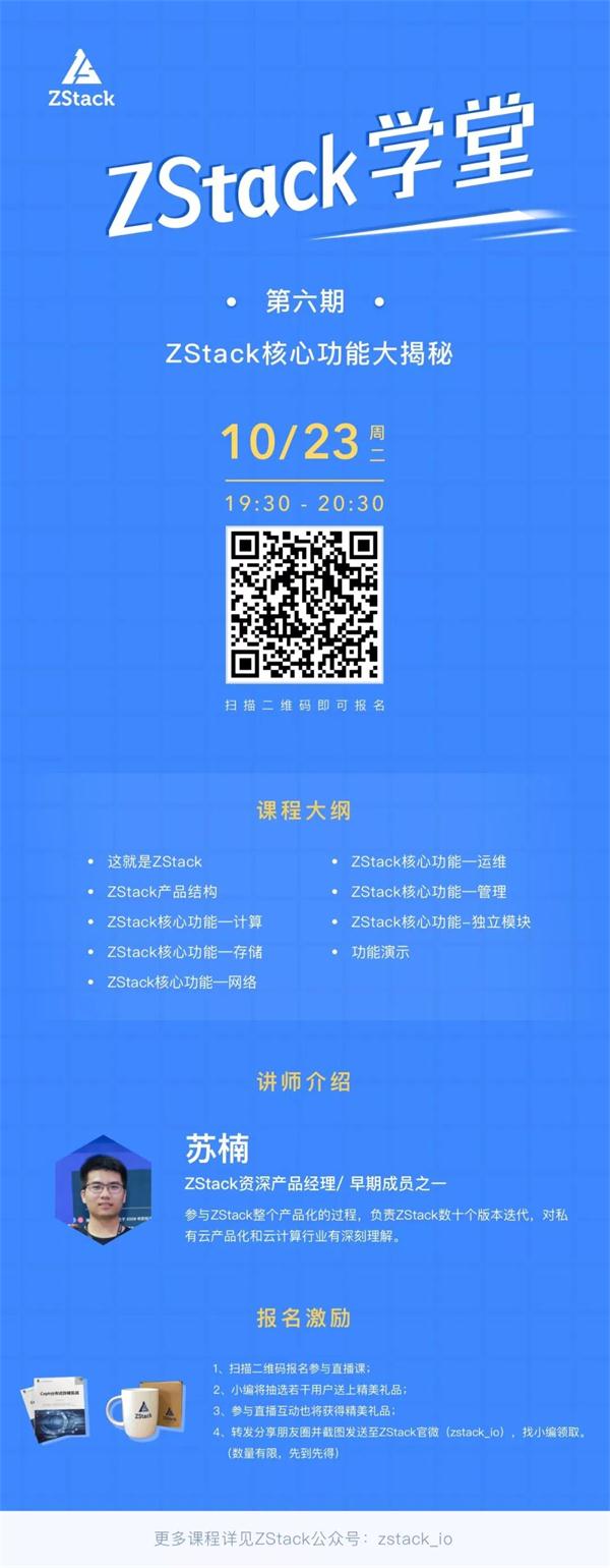 【ZStack学堂】第6期:ZStack核心功能大揭秘——明天19:30开讲。本次课堂为ZStack学堂特别策划,由ZStack资深产品经理苏楠,为您揭秘产品化云平台的核心功能哦!最值得期待的是,课堂现场还将揭晓1024程序员节:锦鲤名单哦!快快点击“阅读原文”或下列“直播间地址”,预约报名吧!