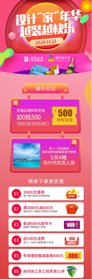 除此之外,在居然设计家今年双11的设计“家”年华活动中,更有每满3000减600、100元抵500元、扫码免费领300元优惠券、活动期间签约享受质保长达11年以及消费金额最高者获得5天4晚的“马尔代夫双人蜜月游”机会等豪华大礼。