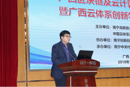 颁发聘书之后,云体系联盟副秘书长薛幼桥为学会的成立作了发言。他指出:广西自治区科技厅与中国云体系联盟联合发起设立“广西云体系创新学会”是云体系联盟与广西科技厅进行实质性合作跨出的重要一步。学会的宗旨是推动与促进广西自治区云体系产业,特别是区块链产业的自主创新和跨越发展,引入国际新一代信息技术的先进理念、技术和经验,突出科学化的组织管理,强调政府社会、产业部门、学术教育、技术研发、职教培训、商务贸易和金融资本的有机结合。学会的职能是全面开展学术研究、技术合作、标准规划、人才培训、产业创新、商务贸易等诸方面的交流探索、研讨开发、试点规范、咨询评估等各项社会活动,引领广西信息产业跨越式发展,带动相关领域生态系统的构建与联动,实现协会成员之间的自愿合作、互利共赢与科学发展。