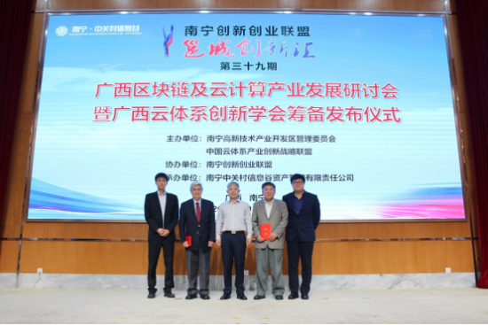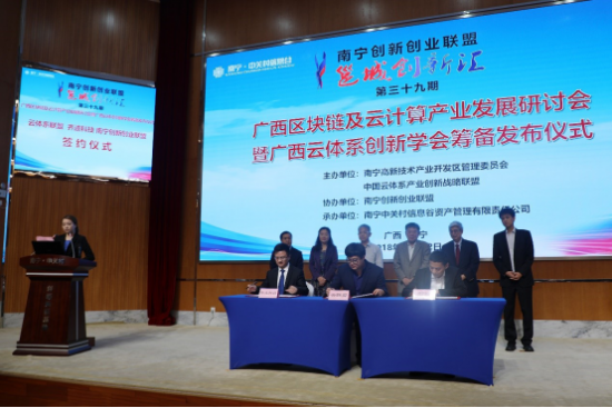 2018年10月22日,由中国云体系产业创新战略联盟、和南宁高新技术产业开发区管理委员会共同主办的“广西区块链及云计算产业发展研讨会暨广西云体系创新学会筹备发布仪式”在广西南宁成功举办。会上举行了云体系联盟与广西科技厅的战略合作协议签署仪式,以及广西云体系创新学会的筹备发布仪式。云体系联盟将与广西科技厅合作,在广西云体系创新学会平台上共同筹建院士和千人计划工作站。