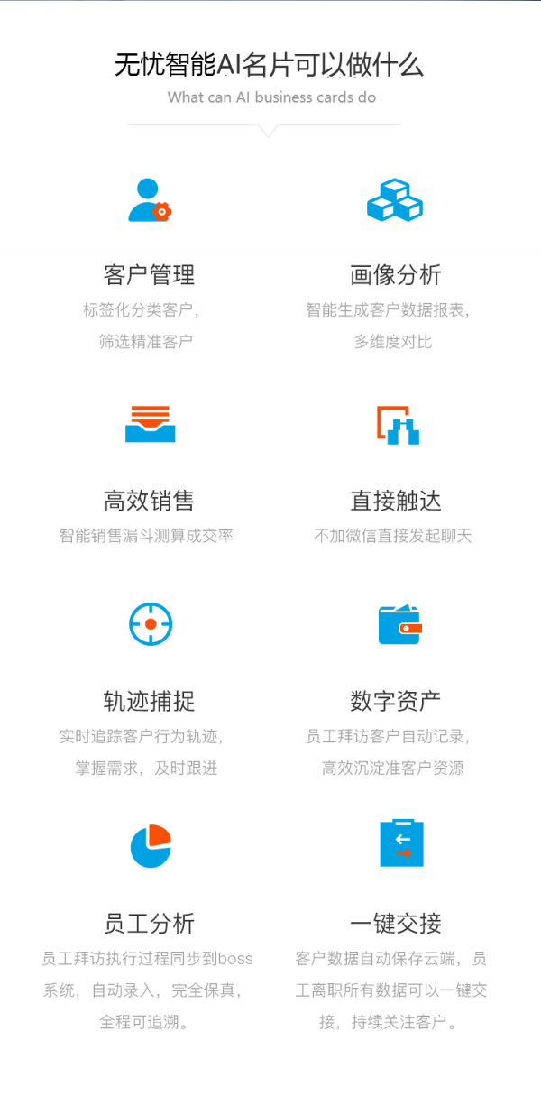 无忧交易通过技术优势,利用人工智能名片交换切入,借助"无需安装、触手可及"的小程序+企业微信CRM管理系统,帮助销售完成销售周期中的海量筛选环节,线上获取、转化、传播、唤醒用户,完成获客、跟进、交易全流程,并通过小程序商城完成销售闭环。