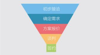 这个过程可分为五个步骤:第一个阶段初步接洽客户,第二阶段确定需求,第三个阶段提供方案和报价,第四阶段商务谈判,第五阶段成交。最终从一个潜在客户变成正式客户。