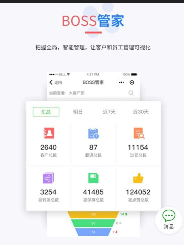 无忧能够记录每个客户的兴趣轨迹、联系动向、互动情况,如客户打开小程序名片页、通过名片留言、点击复制销售员微信、查看主推产品、查看企业官网等行为。管理者通过Boss管家可查看客户总数、跟进总数、浏览总数、转发总数、保存总数、点赞总数、咨询总数等信息,同时也可更直观查看客户漏斗、销售漏斗、小程序流量以及销售的业绩排名,全面掌握签单进程及销售情况。