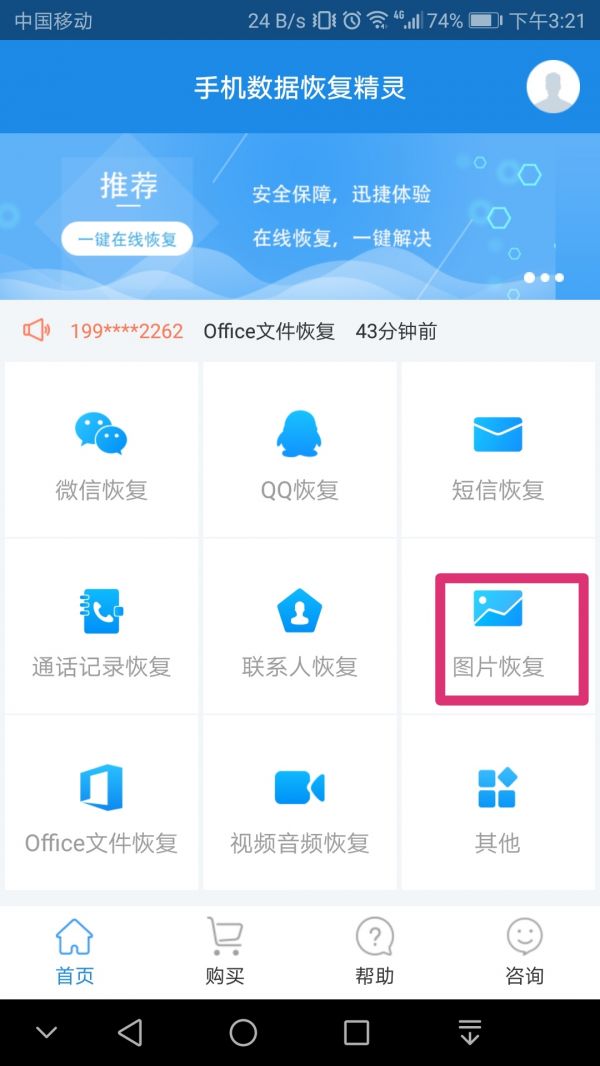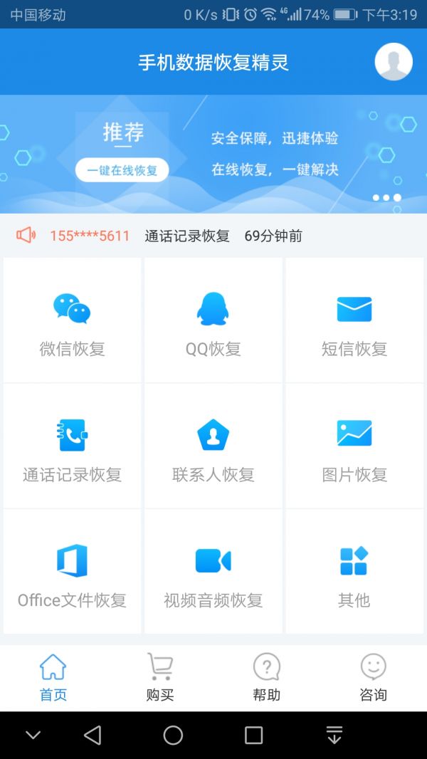 3、 手机数据恢复精灵有九大恢复功能:微信恢复功能、QQ恢复功能、短信恢复功能、通话记录恢复功能、联系人恢复功能、图片恢复功能、Office文件恢复功能、视频音频恢复功能以及其他恢复功能,可以根据自己的需求进行针对性的选择。