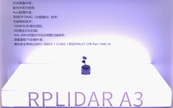 据工作人员介绍,这是思岚科技在今年年初发布的新一代激光扫描测距雷达RPLIDAR A3,基于思岚科技独有的RPVision 3.0激光测距引擎,可以实现25米测距半径,每秒16,000次的采样频率,高达0.33°(15Hz情况)的角度分辨率,不仅能在室内发挥极高稳定性能之外,还新增了户外工作模式。具备更为可靠的抗日光干扰能力,在检测黑白物体、远距离物体及强光直射物体时,测距表现更加稳定,在10-20米内完全解决问题,应用范围可扩大到更多商用甚至工业场景。