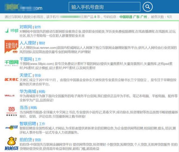事实上,现在有很多网站,通过输入用户手机号码就可以查询该号码在哪些网站已经注册了账号,如: