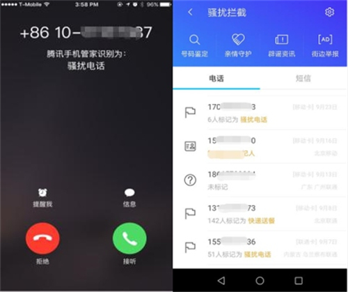 (图:腾讯手机管家精准识别骚扰、诈骗电话)