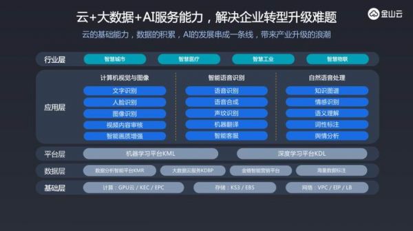 当前,金山云已经构建了覆盖基础层、数据层、平台层、应用层和行业层的完整AI能力,涉及计算机视觉与图像、智能语音识别和自然语言处理领域,提供包括文字识别、图像识别、内容智能审核等产品和服务,通过银河平台,将以上能力进行输出,通过云+大数据+AI全融合,帮助客户构建更强创新力。