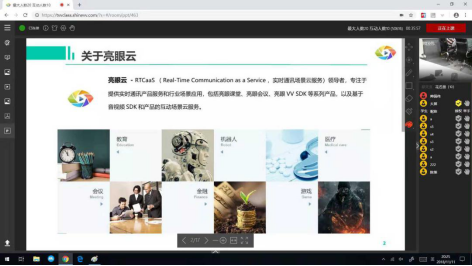 亮眼云(www.shinevv.com),RTCaaS场景化服务的提出者和领导者,提供的RTC+SaaS实时通信场景云解决方案商,在4K高清视频、大并发、高可用、高可靠等方面有完善的技术和解决方案,目前有三个产品,面向音视频RTC+PaaS的VVSDK。VVSDK支持公有云也支持私有部署,以及面向RTC+SaaS的亮眼课堂,亮眼会议产品。亮眼课堂是目前面向在线教育领域的互动课堂,支持一对一,小班课,以及高达50人的大班课。提供电子白板,以及各种互动功能。体验非常好,亮眼云提供免费试用,可以立刻体验实际效果!