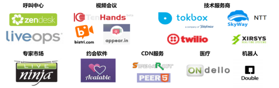 其次,多年的实时通讯技术发展,已经在各个领域得到了广泛应用。主流的实时通讯RTC技术(例如WebRTC)已经能够支持各类终端应用平台,包括网页、Windows和MAC操作系统、手机端(安卓、iOS)等,并且在音视频编解码、辅助增强功能、网络传输优化等方面逐渐成熟。2017年已有超过1600家开发商采用WebRTC实时通讯技术,如下图所示,越来越多领域开始应用最新的RTC技术。RTC新技术的出现,必然带来更多的升级换代需求,各行各业的音视频需求需要更加专业的技术更新服务。