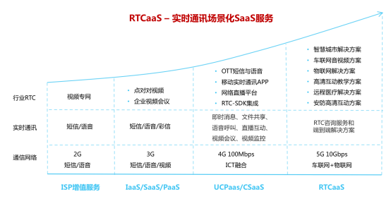 首先,RTCaaS的场景化服务顺应当前通信网络的潮流,从2G的短信与语音时代,到未来的能提供10Gbps高速无线带宽的5G时代,最新的通讯技术提供速度更快、延时更低、网络承载更高的实时通讯网络,可以承载音视频流4K高清画面、毫秒级响应、高并发等各类应用需求。5G时代的实时通讯技术以及伴随而来的车联网、物联网等更多新领域的音视频需求,需要的不仅从技术应用上而且是从客户业务角度提供更好的RTC服务和方案。