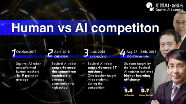 这一自我进化不仅出现在文学上, 教育行业也在发生。松鼠 AI 的教学系统源自于所有的高级教师和特级教师,但教学水平已经远远超过了高级教师和特级教师。 2017年至今,松鼠AI举办了四次教育界的人机大战,结果均显示机器教学组的教学成果优于真人教学组。 其中,在第四次的百城人机大战中,在最核心的平均提分上,真人教学组平均提高0.7分,二、而机器教学组平均提高5.4分,AI 教学组学习的知识点数量也超过真人教学组的28个, 达到了 42 个。