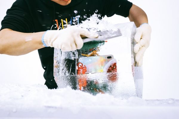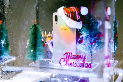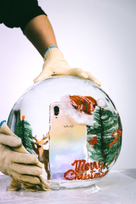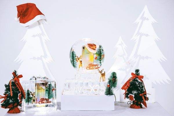 为了造出梦境中的圣诞氛围,vivo特地打造了两款幻彩冰雕,将两部X23幻彩版真机封印在其中,在幻彩镜面玻璃的反射下,营造出五光十色的白色圣诞奇景。
