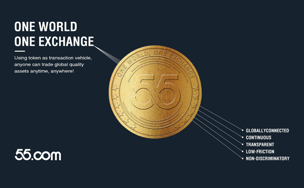 55全球市场是全球首家以通证为载体实现全球优质资产无缝高效流动的资产交易网络,通过区块链技术和通证经济模型构建了一个全球连通的、连续的、透明的、低摩擦的、无歧视的资产交易网络,参与交易的资产品类并不局限于类似BTC或ETH的加密资产,而是将更广泛的流动性引流到更广义范畴的资产池和新形态资产池, 例如房地产, 股票股权,债券,外汇,贵金属、潮牌商品等。