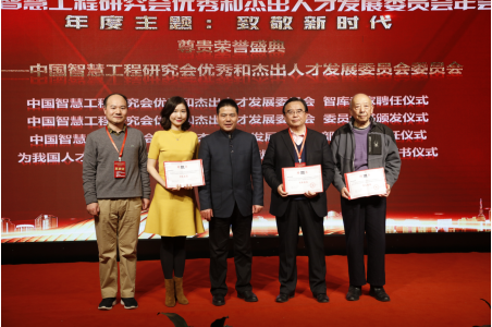 中国智慧工程研究会优秀和杰出人才发展委员会蒋锡培主席(中间)与中国优秀和杰出人才发展委员会副主席杨超研究员(左一)代表委员会向国家有突出贡献专家、政府特殊津贴获得者、原天津轻工学院院长张管生教授(右一),文化部文化艺术人才中心高级评委、中国人民大学文化创意产业研究所所长金元浦教授(右二),全球化智库(CCG)联合创始人兼秘书长苗绿博士后(左二)颁发中国智慧工程研究会优秀和杰出人才发展委员会智库专家证书。左一为北京科技人才研究会理事长、中国智慧工程研究会优秀和杰出人才发展委员会副主席杨超研究员。
