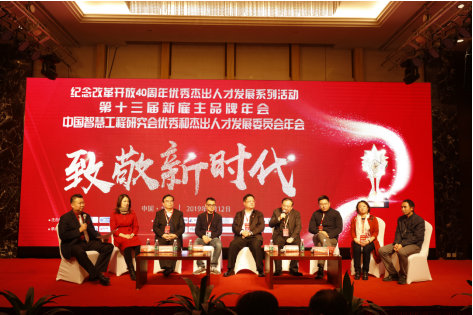 “改革开放与优秀和杰出人才的成长成才”高峰对话环节,气氛热烈、观点新颖。对话嘉宾来自于科技、教育、策划、文化创意、农业农村、企业、服务等领域,他们分别围绕着改革开放与优秀和杰出人才的成长成才进行精彩的分享。参与对话的嘉宾有中国人民大学文化创意产业研究所所长、国家重点学科文艺学学科带头人金元浦教授(左三),清华大学教授、国家“千人计划”专家张灏野教授(右一),著名策划专家、改革开放40年影响四川40人、中国智慧工程研究会优秀和杰出人才发展委员会副主席杨健鹰教授(左四),河南省人大代表、国家级有突出贡献专家、中国智慧工程研究会优秀和杰出人才发展委员会副主席张卫宪教授(右五),举贤网科技(北京)股份公司董事长、中国人力资源研究会人才研究中心主任、中国智慧工程研究会优秀和杰出人才发展委员会常委王尚峰(右三),第十二届全国人大代表、全国劳动模范、中国智慧工程研究会优秀和杰出人才发展委员会常委朱良玉(中),全国青联常委、全国农村青年致富带头人标兵、中国优秀和杰出人才发展委员会常委副秘书长吴艳(右二),首都经济贸易大学劳动经济学院副教授、知名人才学家陈书洁(左二)等分别做了精彩的分享。