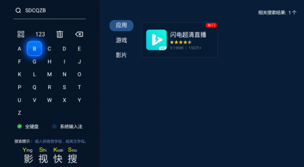 当贝市场成功安装以后,就可以在里面搜索“SDCQZB”,下载安装闪电超清直播,畅享大屏超清直播内容啦!闪电超清直播是一款直播源清晰不卡顿的第三方软件,不仅拥有着众多的地方节目,而且超清稳定的直播源相信一定会给大家带来惊喜,内容丰富,而且操作简单,有多种解码方式可切换。