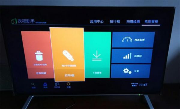 然后将U盘连接东芝电视USB接口,运行【欢视助手TV】,选择【电视管理】-【打开U盘】,然后打开安装包,找到当贝市场apk,点击并确认安装即可,安装进程会自动运行,稍等几分钟即可,安装期间需保持电视不断电、屏幕不黑屏;