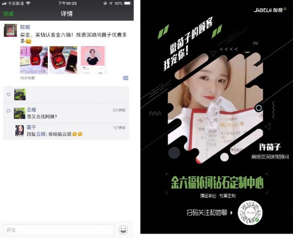 “有时候店没开,出门就收到客户预约到店购买的提醒。”依珂钻石高级顾问茵子告诉加推。聪明的她利用加推工具把身边的流量串联起来,客户咨询、订单蹭蹭上涨。