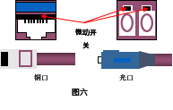 这一技术也可在光口和铜口上使用。如图六所示,它在接口上采用了微动开关,当跳线插入时,开关被推动,触发回路闭合;跳线拔出后,微动开关复位,回路断开,这样就可以实时监测链路的通断。
