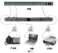 这种方式中在链路中只部署一个配线架,通常也叫做“单配”方式。如图三所示,配架模块正面的RJ45端口通过跳线连接交换机,背部通过水平线路(即双绞线)连接工作区模块。