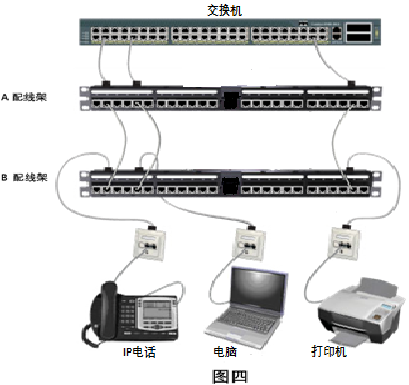 交叉连接方式又称“双配”方式,顾名思义就是在链路中部署了两个配线架。该方式如图四所示,网络交换机的端口会有一根跳线连接到A配架模块的后部,工作区模块也通过水平链路连接到B配架模块的后部,这两段线路是固定不动的,两端端口的连接也是一一对应的,两段线路通过A、B两个配架正面端口来连接,所有的跳接工作只发生在A、B配线架的正面端口。