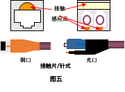 该技术如图五所示,在铜口和光口上都可使用。接口下部或上部有铜感应点/带,跳线护套上有铜触针/触片。跳线插入接口后,跳线触针/触片接触接口的感应点,链路形成回路,拔出跳线时链路断路。依靠这个原理,我们就可以实时监测跳线的插拔和端口的对应关系。
