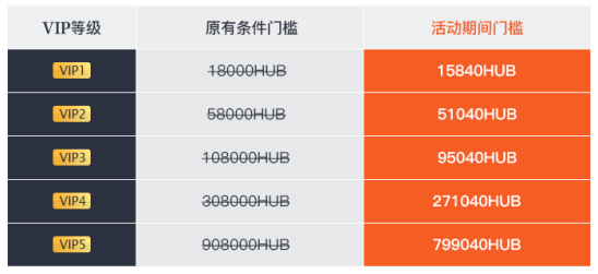 活动期间,Hubi VIP会员8.8折,限时特惠!例如:原来达成VIP1的条件是30天内需持有18000HUB,而活动期间,只需30天内持有15840HUB,即可成为VIP1。
