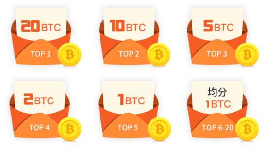 活动期间,累计HUB交易量(买入量+卖出量,但不含自成交)排名前20的用户 ,可获得如下奖励: