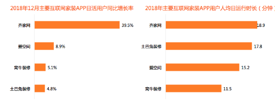此外,2018年12月主要家装APP日活用户增长率中,齐家网最高,为39.5%;爱空间排名第二,为8.9%。比达报告认为,齐家网与浙江美大等众多知名企业连续达成战略合作,打造家居品牌权威评价体系,得到市场、政府、用户多方面认可,活跃用户增长态势较为强劲,土巴兔则出现掉队情况,日活用户增长率低于爱空间、蜗牛装修等其他二三线品牌,下滑态势明显。
