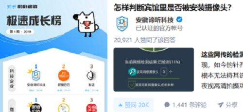 DT小听推出不到三个月,已为6万余名用户发现了2万余个联网摄像头。前不久,DT小听获评“2019最实用的安全保障App”,其开发公司安徽谛听科技也一夜间蹿红,在知乎上获赞20k+,超越互联网巨头阿里巴巴,荣登盐值(知乎对机构号知识、素质、贡献进行的综合评分)极速增长榜-科技企业榜首!这款App的受欢迎程度可见一斑!