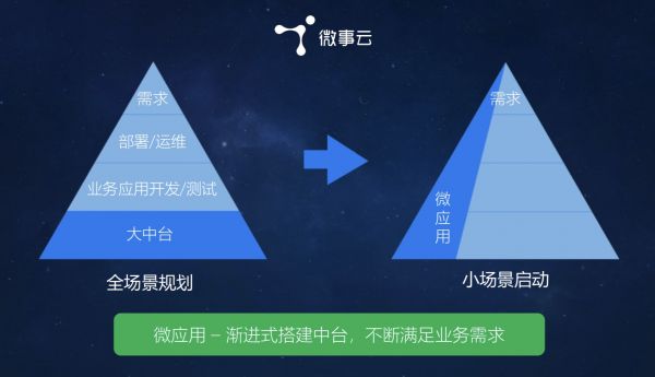 之所以将“微应用中台”比作“云中天梯”,是因为“微应用中台”的服务模式不同于传统的系统开发,而是像梯子一样直达企业痛点,而非传统的开发方式。