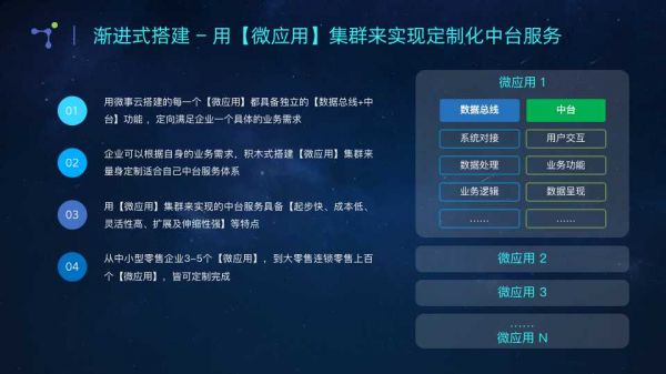 用“微应用”集群来实现的“微应用中台”具备“起步快(1-2周开始见效)、成本可控(1-2万起步,并可根据预算逐步增加)、灵活性高、扩展及伸缩性强”等特点。从中小型企业3-5个“微应用”,到大型企业上百个“微应用”,皆可通过这个方式量身定制完成。