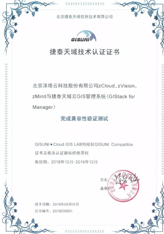 2019年初,泽塔云与全球领先GIS平台软件及服务提供商Esri公司在中国的战略合作伙伴GISUNI,经过兼容性验证和性能测试后,双方完成了产品的相互认证。