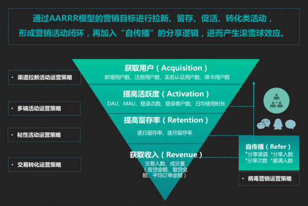 首先,我们先对互金产品的整个运营体系有一个概览。从aarrr模型来看整体的运营,从你获取用户a,到用户活跃,再到用户留存,再到付费转化,到最后的自传播,这是一个完整的运营体系。
