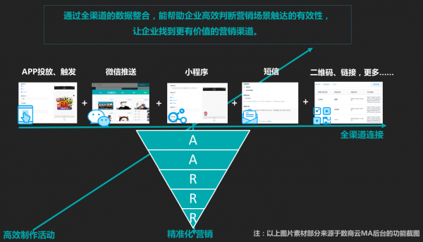 在这里大概说一下,自动化营销在国外主要应用在发邮件、发社交媒体,国内主要发短信、app push、发公众号等等。通过自动化营销技术,效率优于人工操作的多渠道联动营销,令全渠道用户数据连接变得更简单,更高效。
