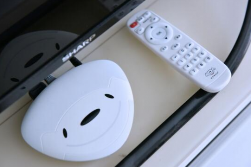 爱奇艺电视果网络机顶盒看起来非常小巧,外壳采用的是PC材质,上下盖均采用亮面设计,经过磨砂的电视果中正央印这爱奇艺的LOGO,看起来不突兀。因为爱奇艺盒子小巧所以放在家中一点都不碍事,不会占到太多空间。