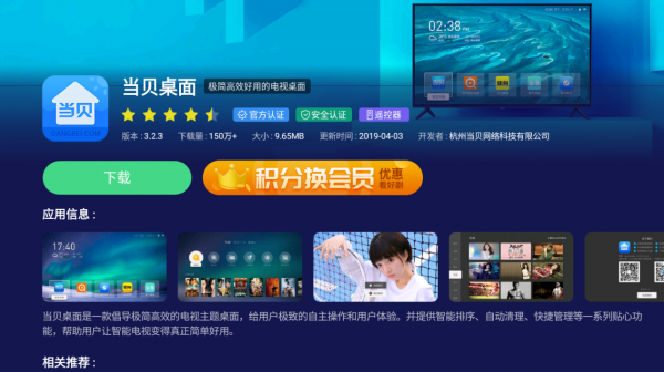 当贝市场包含影音、游戏等多款应用,浏览器、生活助手、直播应用、视频应用、音乐娱乐、电视游戏等分类多达数十种,用户可通过当贝市场一键极速下载需要的智能大屏软件。