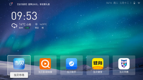 用户进入当贝桌面后,可在主页面快捷添加五款常用的智能软件及应用,这可以帮助用户提高当贝投影仪F1的使用效率。